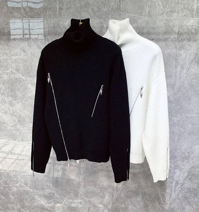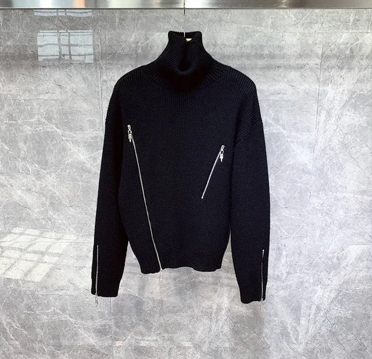 High Collar Knit Sweater Male Black Zipper Pullovers Turtleneck Men's Clothing W